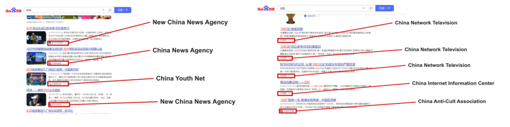 To better understand the domains authorized by these search engines, we categorized them into three categories (see Table 12). The majority of sites on each list were Chinese state-approved news sites. Examples include xinhua.org (Xinhua News Agency), people.cn (People’s Daily), and qq.com (QQ News). Sites from this category professed varying degrees of loyalty to the Chinese Communist Party (CCP), ranging from presenting the necessary regulatory license to practice journalism to statements such as these from huyangnet.cn (Authoritative information release platform of Xinjiang production and Construction Corps) indicating Party sponsorship (translated): “Bingtuan Huyang.com is a key news portal website of Bingtuan, which is approved by the Information Office of the State Council and sponsored by the Propaganda Department of the Party Committee of Xinjiang Production and Construction Corps.”