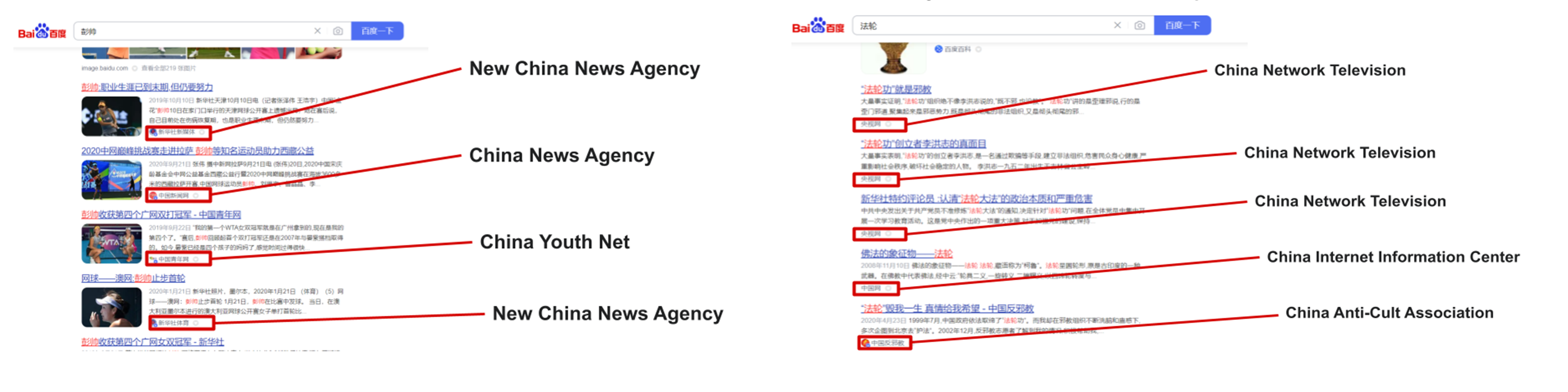 In this work we analyze a total of eight different search platforms. Three of the search platforms are web search engines, including those operated by Chinese companies — Baidu and Sogou — and one operated by a North American company — Microsoft Bing — whose level of censorship we found to in many ways exceed those of Chinese companies. While China’s national firewall blocks access to webites, the role that Baidu, Microsoft, and Sogou play in controlling information is in overcoming two of the firewall’s limitations. First, due to the increasingly ubiquitous use of HTTPS encryption, China’s firewall can typically only choose to censor or not censor entire sites as a whole. However, these search engine operators overcome this limitation by selectively censoring sites depending on the type of information that the user is querying. Second, China’s firewall operates opaquely, displaying a connection error of some kind in a user’s web browser. By hiding the very existence of sites containing certain political and religious content, Baidu, Microsoft, and Sogou aid in preventing the user from being informed that they are being subjected to censorship in the first place.