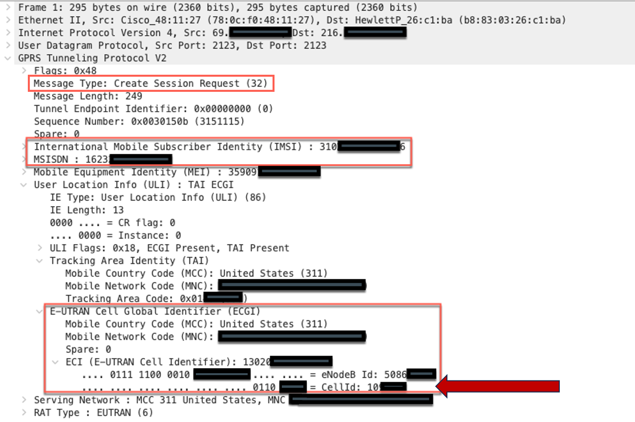 The packet capture shown in Figure 7 indicates that the IMSI, MSISDN, and IMEI of a mobile user has been revealed while attempting to establish a data session, as indicated by the GPRS Tunneling Protocol “Create Session Request” message. The request specifies the User Location Info (ULI), which provides the information necessary to derive the current global location of the user including the country, mobile network operator, base station, and Cell ID of registered user.