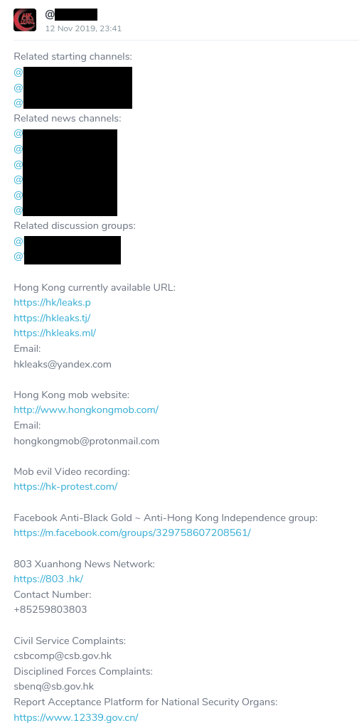 • Some doxxing used privileged information, only available to the Hong Kong and/or Chinese authorities.