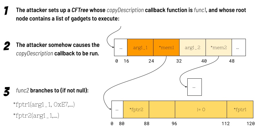 Because the attacker (presumably) controls the data in the CFTree, and because the CFTree‘s copyDescription callback gets a pointer to the CFTree‘s root node, the attacker can craft the contents of the node to line up a series of additional gadgets (and first arguments) to be executed, provided that PAC-valid (with context of zero) pointers to these gadgets are available.