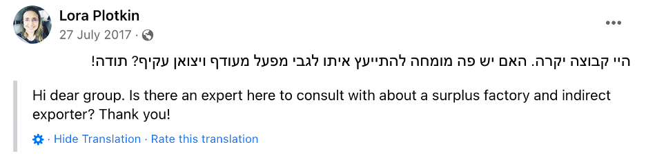 - Lora Plotkin: Along with being a former shareholder of QuaDream, according to the Cypriot Case File, Plotkin is also the former finance manager at InReach. QuaDream claims in the Cyprus proceedings that she was the method by which QuaDream exercised oversight of InReach’s finances. Plotkin is a member of a Facebook group called “Questions and Answers – Help for startups.” In July 2017, three months before the agreement with InReach was signed, she posted a message on the group asking to consult with an expert on “indirect” exporting.