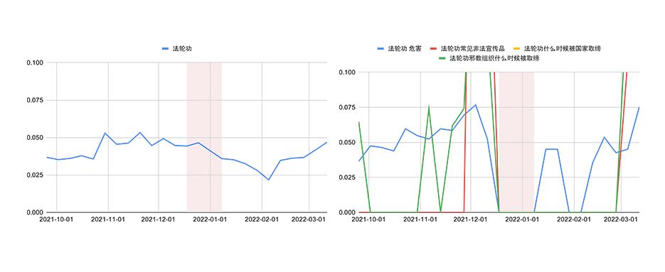 Figure 13: Search trends for 法轮功 (Falun Gong) (left) and for its autosuggestions (right).