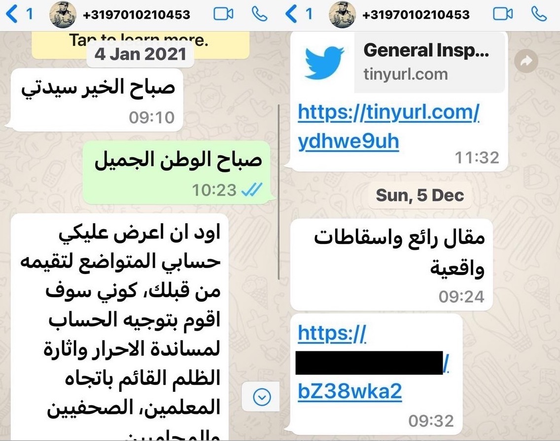 We also identified the following WhatsApp messages on Jaradat’s phone, impersonating a popular anti-government Twitter user in Jordan https://twitter.com/GeneralInspect2: