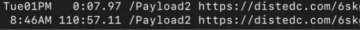 While examining the iPhone logs we determined that, on June 30, 2021, two commands “/Payload2” were running on the phone (PIDs 339 and 1272), and that these commands had been launched with a single argument, a URL on distedc[.]com. The commands were running as root.