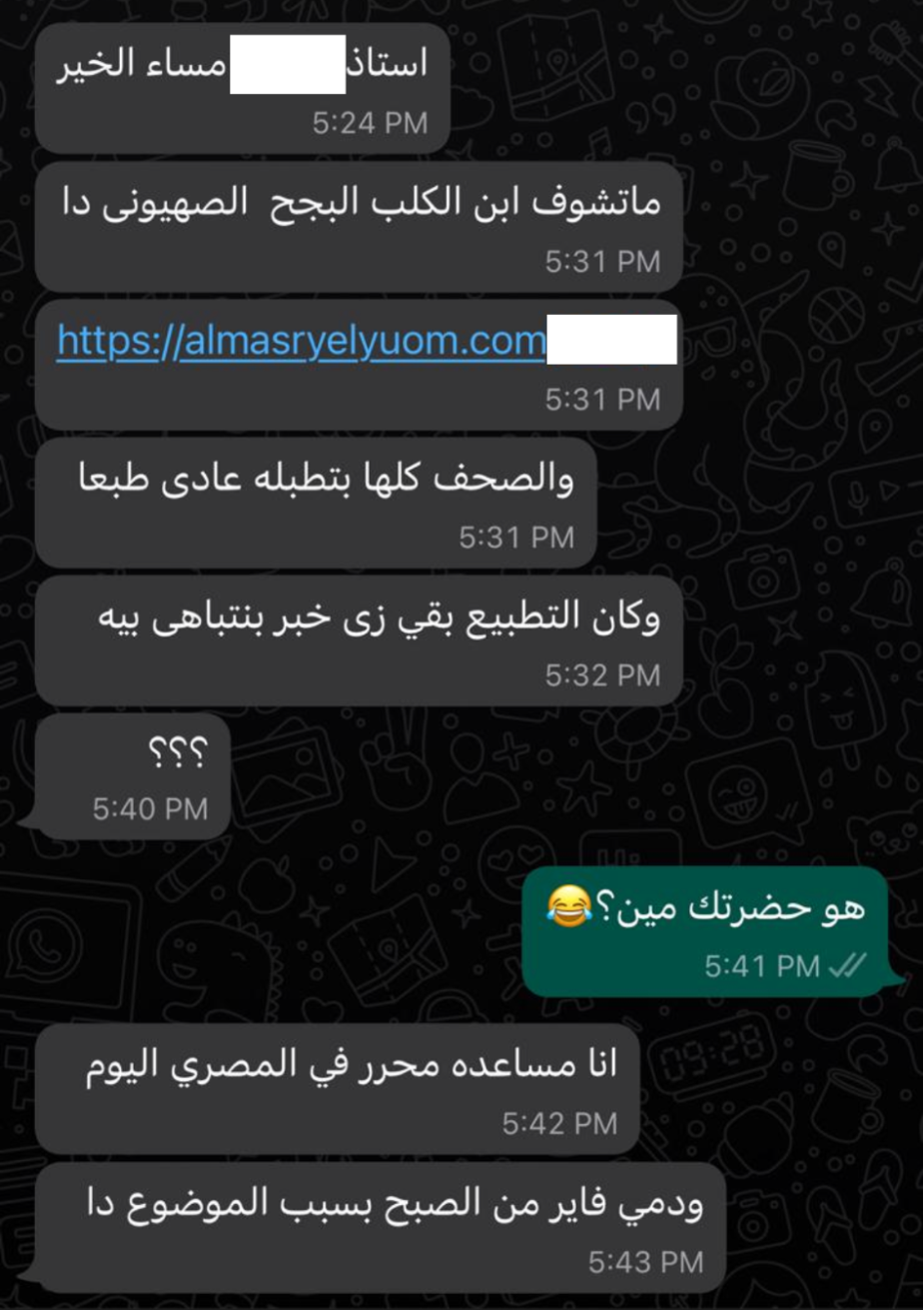 The second target, an Egyptian journalist in exile who is the host of a popular news program, received one message on WhatsApp from an unknown number (+201201407595) with a link to the same almasryelyuom[.]com website.