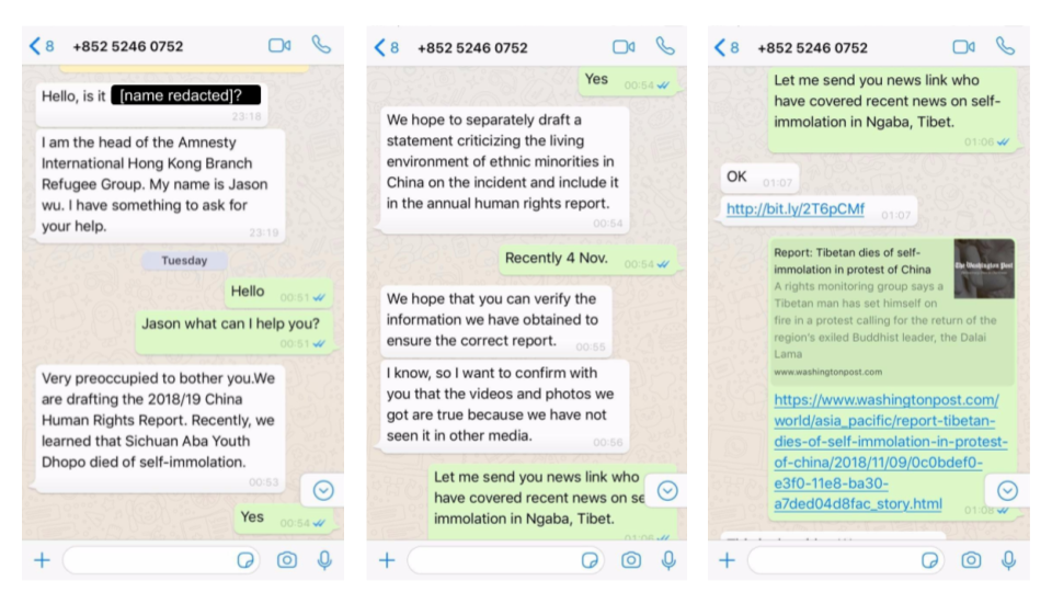 On November 13, 2018, a senior staff member at a Tibetan human rights group was contacted on WhatsApp from a previously unknown number. The persona claimed to be “Jason Wu,” head of the “Refugee Group” at Amnesty International’s Hong Kong branch. There does not appear to be any “Jason Wu” currently employed by Amnesty International.