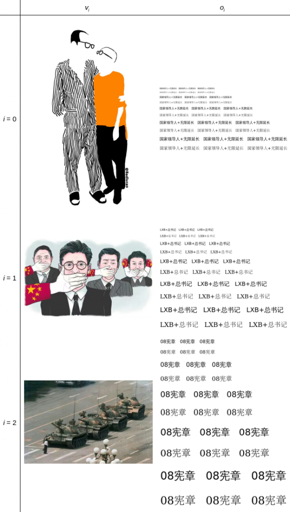 We measured hash eviction using six different source images comprising three test pairs, as shown in Figure 6. Each test pair i, 0 ≤ i < 3, consisted of one source image vi filtered by visual similarity and one source image oi filtered by OCR. Each image filtered by visual similarity were politically sensitive images: one concerning Liu Xiaobo’s death, one related to the 709 Crackdown, and one of the historical picture of “Tank Man.” Each image filtered by OCR were images generated containing a politically sensitive keyword combination known to be filtered. The three sensitive keyword combinations we used were “国家领导人 [+] 无限延长” (national leader [+] unlimited extension), “LXB [+] 总书记” (Liu Xiaobo [+] General Secretary), and “08宪章” (Charter 08). To generate an image from each of these phrases, we created an image containing the keyword combination multiple times in a variety of font sizes and styles. Specifically, we created an image with ten lines each containing the keyword combination repeated three times, where the font size of line ℓ, 0 ≤ ℓ < 10, is 12 + 4·⌊ℓ / 2⌋ and where the even lines are written in a 黑 (Hei) typeface and the odd lines are written in a 明体 (Ming) typeface.