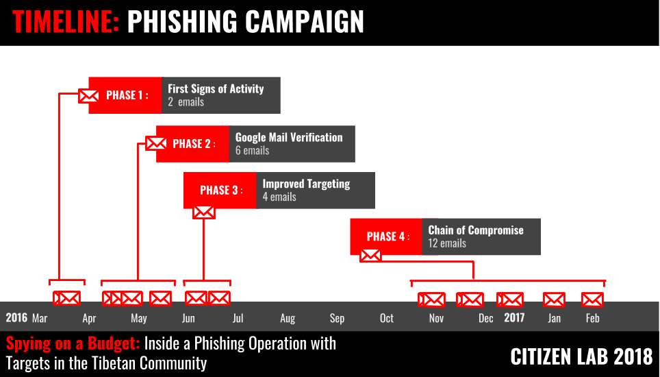 Between March 21, 2016 to February 21, 2017 we collected 24 phishing emails sent to Tibetan human rights groups and email addresses associated with the CTA. We cluster these emails into four distinct phases based on time, social engineering tactics, and infrastructure. Figure 19 shows a timeline of the phishing operation divided into the four phases. We detail each phase in the sections below.