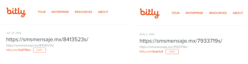 Publicly available data from the bit.ly shortener confirms that the NSO links were shortened on the same days that the messages were reported received (July 27 and August 2, 2016).