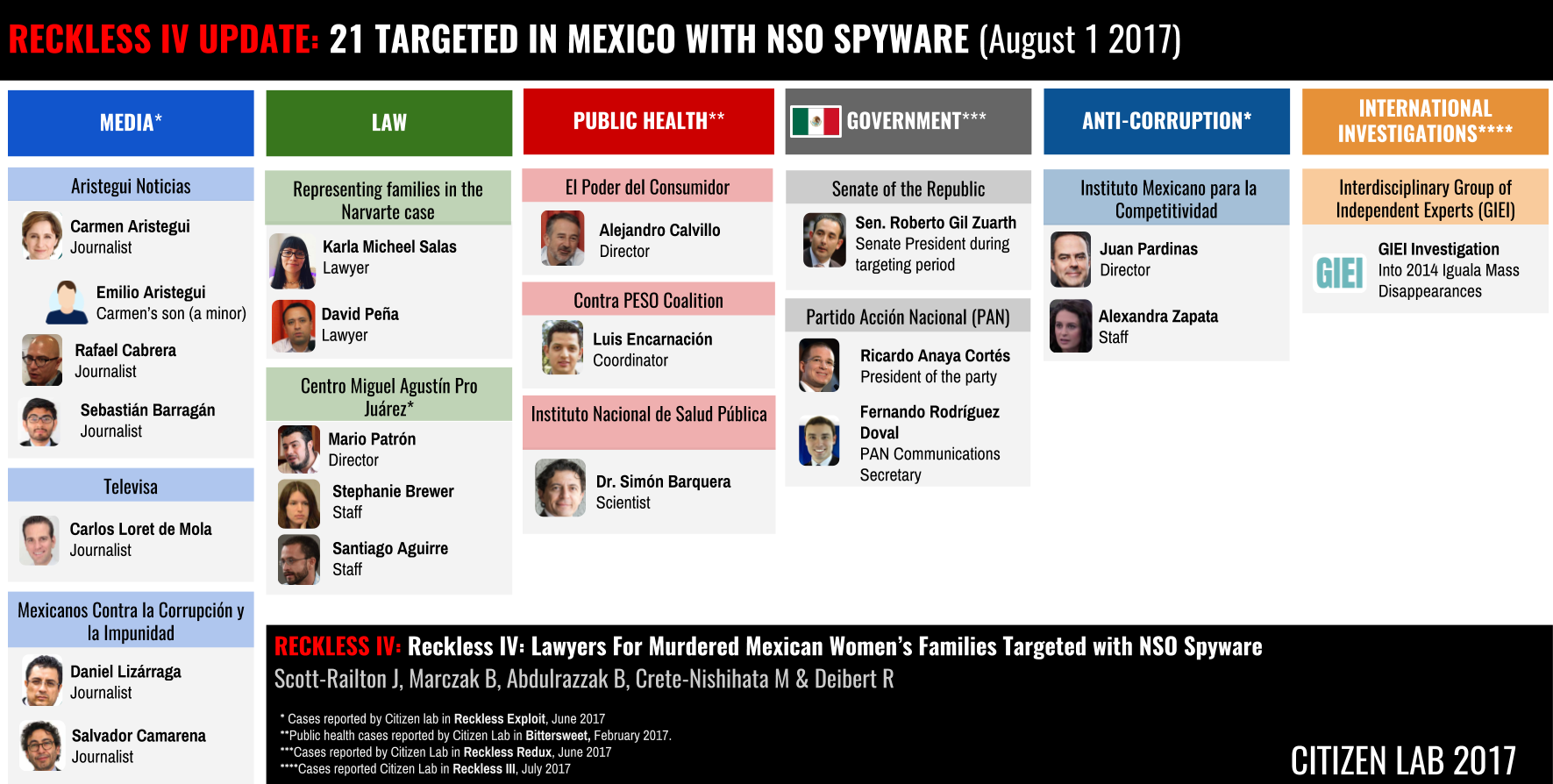 In four prior reports, Citizen Lab and our partners R3D, SocialTic, and Article19 have documented extensive abuses of NSO Group’s spyware in Mexico. Targets have included journalists, anti-corruption groups, health scientists, political figures, opposition party officials, and international investigators. In total, we have now publicly reported 21 cases in Mexico of abusive targeting with NSO’s spyware.