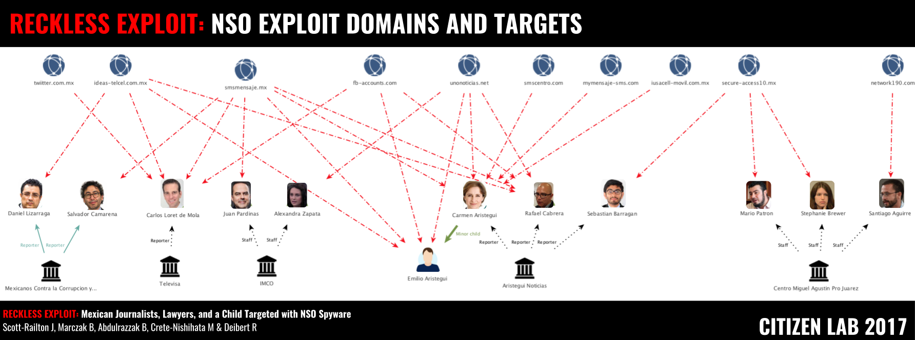 Television personality and investigative journalist Carmen Aristegui, along with her son Emilio Aristegui (a minor), were the most heavily targeted individuals we identified. Other media targets include several journalists working with Aristegui Noticias (a well known Mexican news organization that emphasizes independent, investigative journalism), including Rafael Cabrera and Sebastián Barragán. From a more mainstream media direction, Televisa anchor Carlos Loret de Mola, was also extensively targeted. In addition, Salvador Camarena and Daniel Lizárraga, both journalists specializing in investigating corruption with Mexicanos Contra la Corrupción y la Impunidad (MCCI: Mexicans Against Corruption and Impunity), were also targeted with infection attempts. Both Camarena and Lizárraga had previously collaborated with Aristegui Noticias.