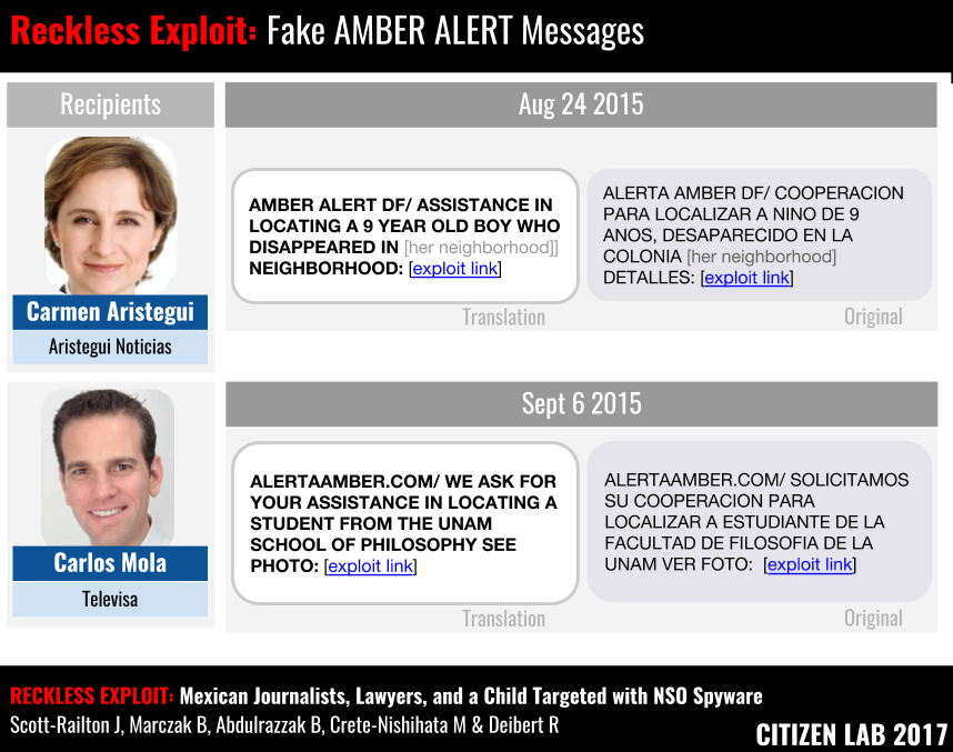 On January 12 2015, Carmen Aristegui received a text message saying that the “previous message was not sent” along with a link that led to NSO Group’s Exploit Framework. Over the next year and a half, Aristegui received a further 25 messages that included NSO links purporting to come from: the US Embassy in Mexico, Amber Alerts, colleagues, people in her personal life, her bank, phone company, and notifications of kidnappings.