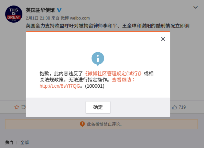 Chen Guiqiu (陈桂秋), wife of Xie Yang, stated that she was approached by Chinese public security forces and asked “not to contact relatives of other detained lawyers; not to leave the country; not to take interviews from foreign media; not to disseminate information relevant to the 709 case on WeChat or Weibo.” On February 1, 2017, the British Embassy in China posted an EU statement on its official Weibo account (a popular Twitter-like service in China), calling for an investigation of “the account of torture in the case of Xie Yang and the allegations of torture in the cases of Li Heping (李和平) and Wang Quanzhang (王全璋),” as well as “the release of the lawyers and human rights defenders who remain in detention, including Jiang Tianyong.” Figure 1 is a screenshot showing that Weibo users were not able to repost or comment on the post.