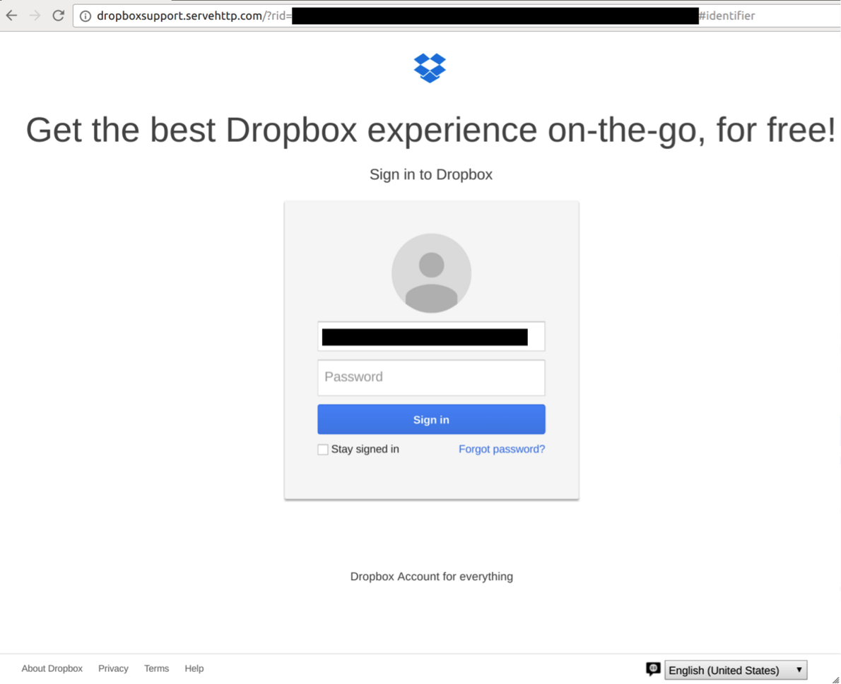 Clicking on the link leads to a Dropbox credential phishing page pre-populated with the target’s username.
