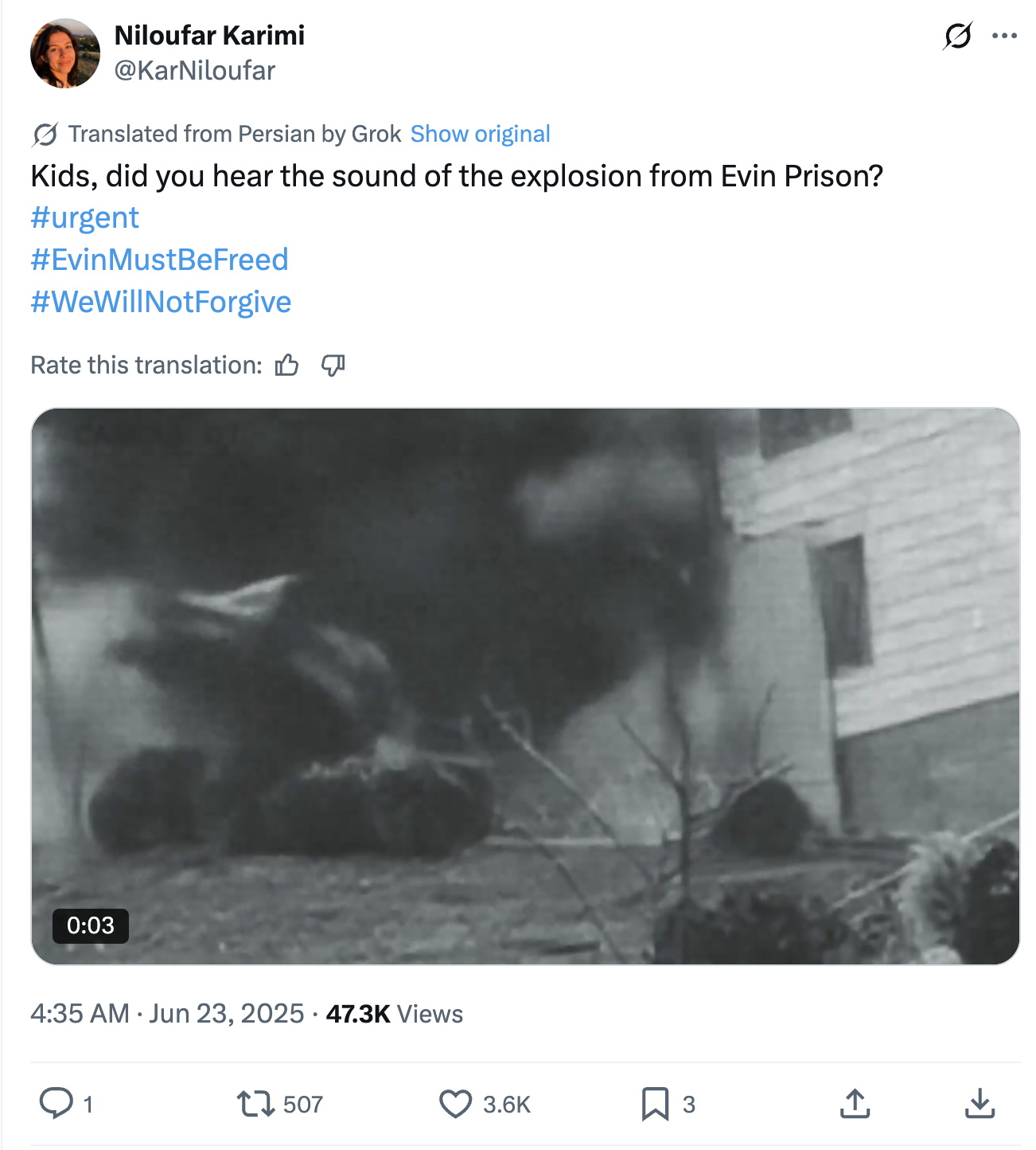 Figure 1. Screenshot from a post made at 11:52 a.m. (Tehran time) on June 23, 2025 by @kavehhhame. This was the first post by a confirmed account from the PRISONBREAK network announcing the bombing of the Evin Prison by the IDF. - At 12:05 p.m. (Tehran time), when the strikes were reportedly still underway, another confirmed PRISONBREAK account – @KarNiloufar, the oldest account in the network – published a post including a video of the alleged moment of the strike on the prison’s entrance.
