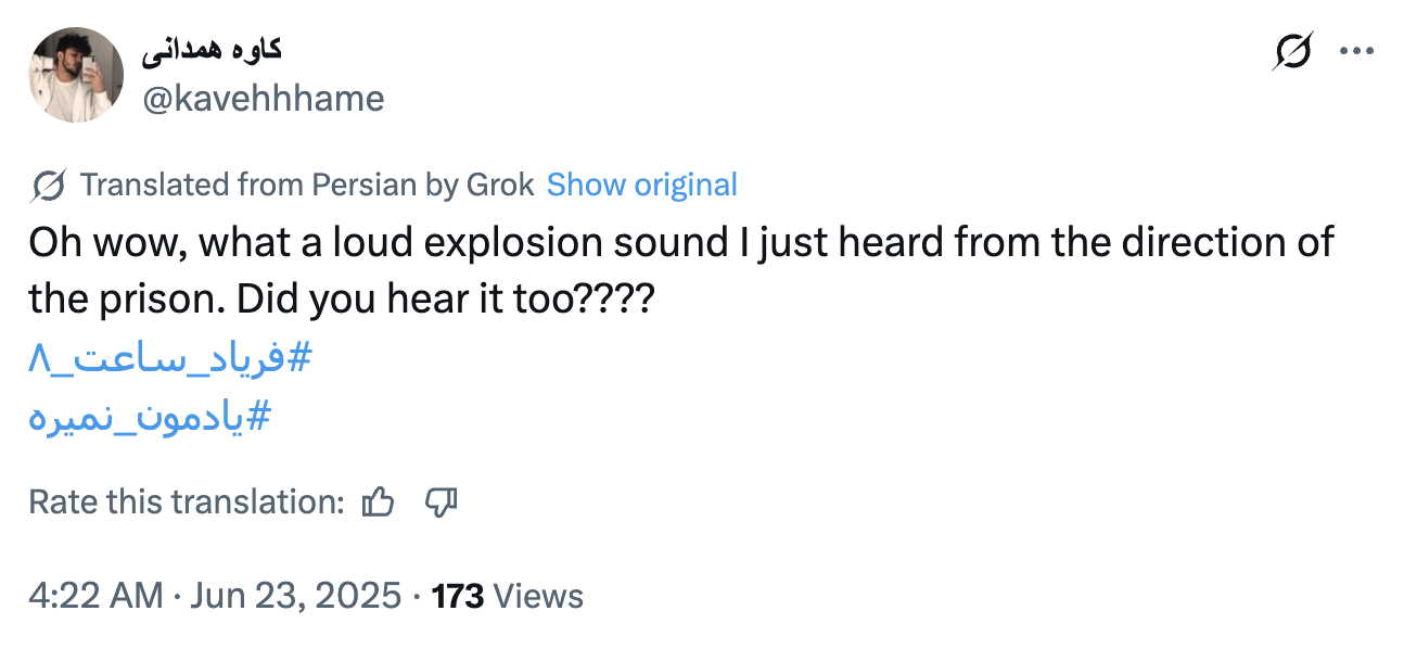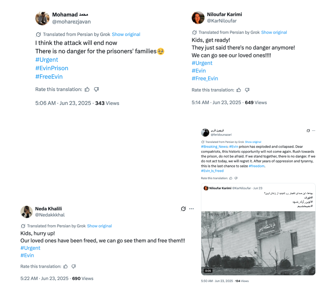 It was at this stage – beginning at 12:36 p.m. Tehran time, with the bombings having reportedly ended at 12:18 p.m. – that the network started explicitly calling for the capital city’s population to reach Evin and free the prisoners. The X accounts also posted reassuring statements such as “the attack will end now” and “the area is safe”.