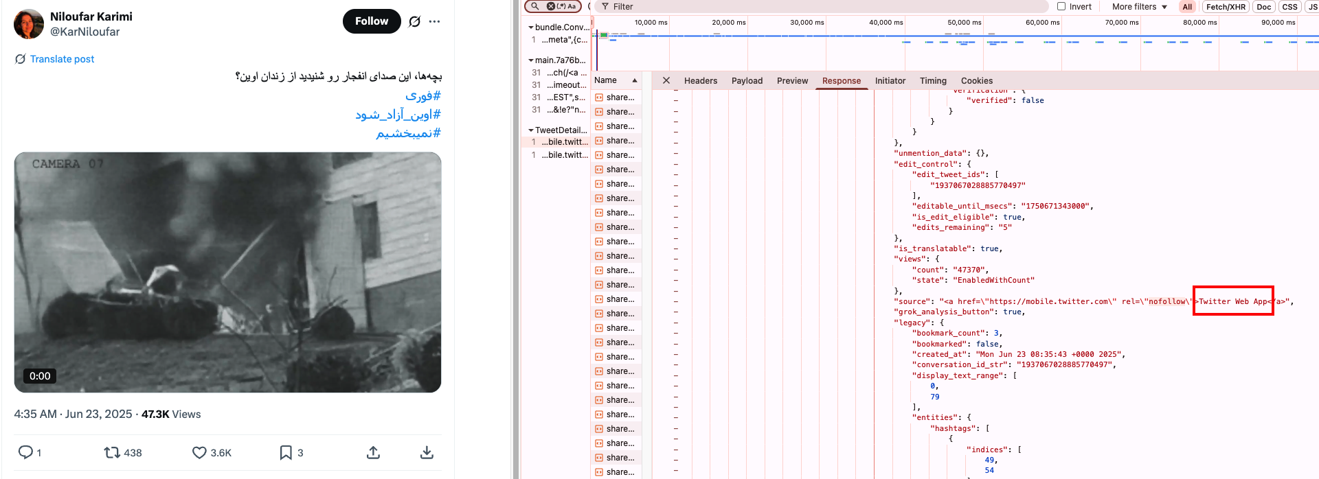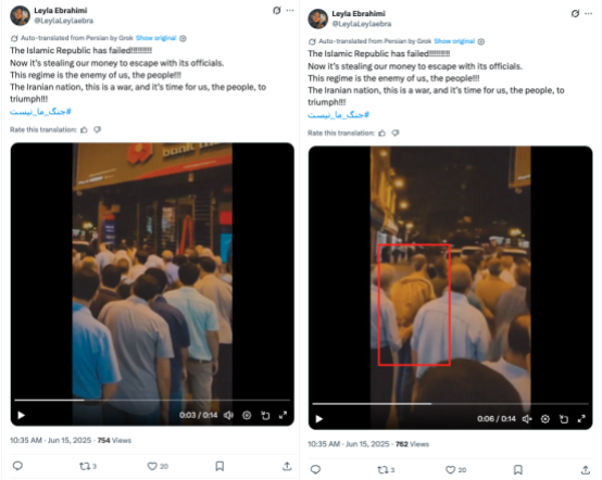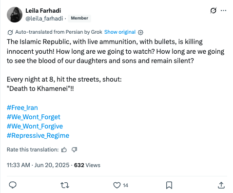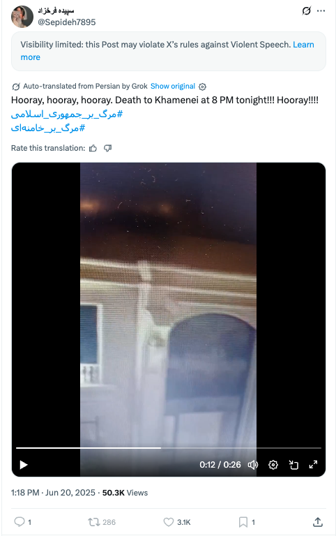 | https://x[.]com/TelAviv_Tehran/status/1937802054040166908 | https://x[.]com/Nedakkkhal/status/1937803510533464177 | Composite of photos and videos of protests and executions of civilians in Iran, with an ending claiming that “Iran is looking forward to a brave, new leader”. |