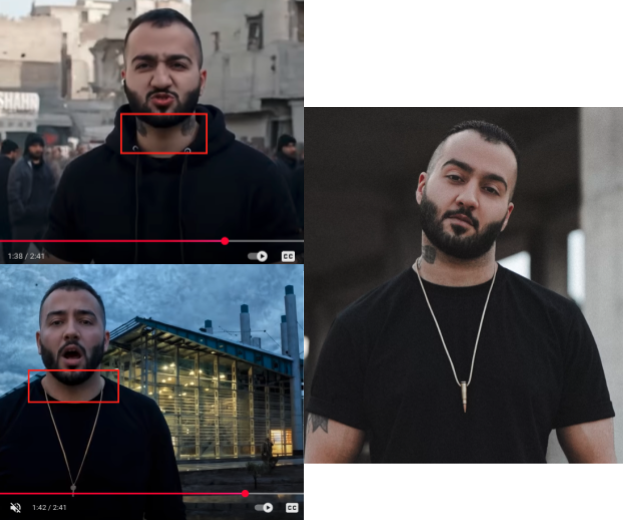 The video and a short extract from it were the only ones posted on the YouTube channel4 “جنگ زندگی” (“The War of Life”) – which was created the same day it uploaded the song (August 13, 2025). The clip features several distinct AI failures – including a person walking backwards (who appears to be a “double” of Hajipour), crowds of people moving as a singular sliding unit, and misplacement of Toomaj Salehi’s tattoos (either duplicated or not present). We provide one example of the AI mistakes below.