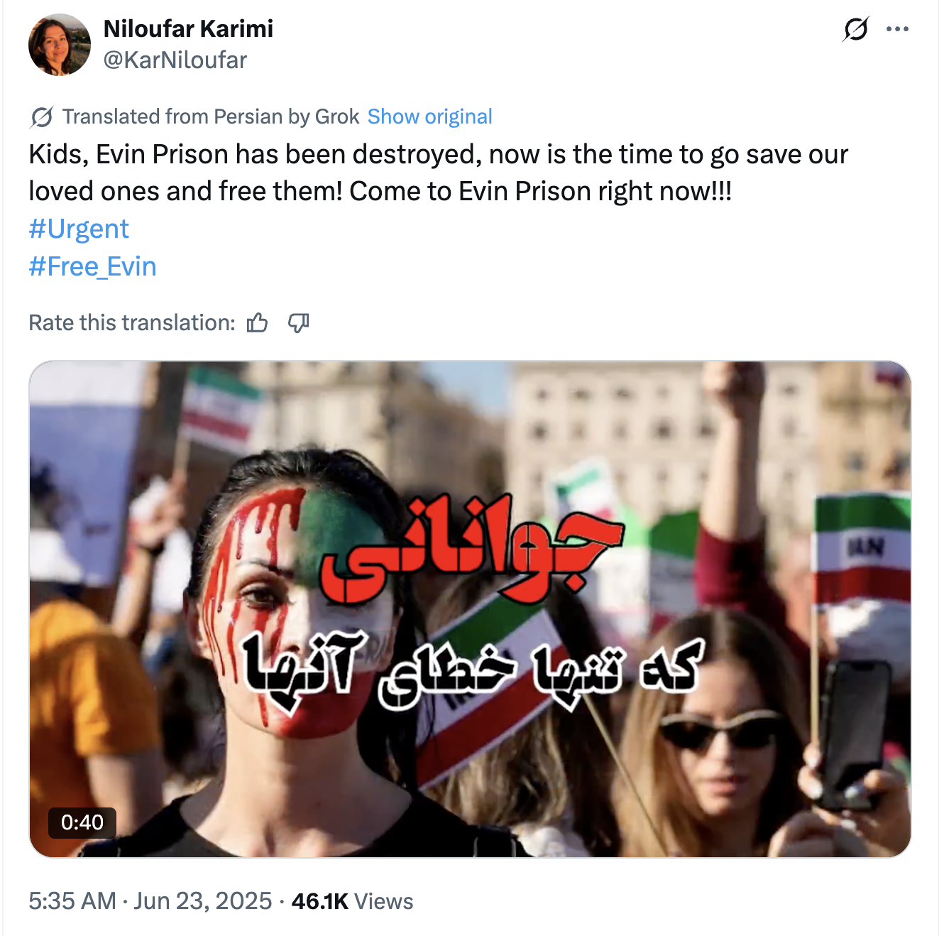 This series of posts by the PRISONBREAK network’s accounts following up to the AI-generated video and calling for people to reach the prison achieved virtually no organic engagement, and a very low amount of views, with one exception: the following post by the original video sharer, @KarNiloufar, which also included a video, managed to accrue 46,000 views and more than 3,500 likes. The PRISONBREAK network reshared the post several times.