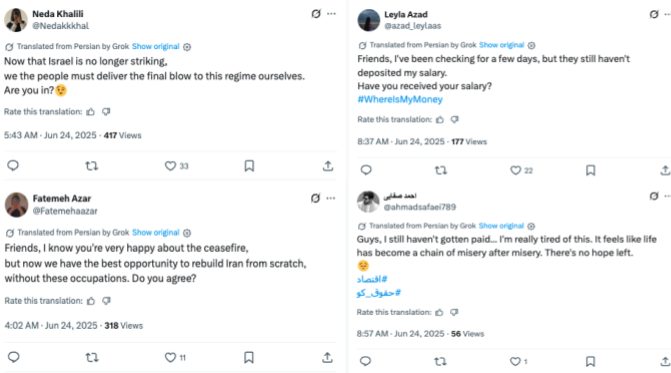 These posts appeared to be a buildup to the Evin Prison deepfake, again pushing narratives promoting regime change in Iran. The network failed2 to drive Iranians to Evin Prison to free the political prisoners, but that did not stop their dissemination of content promoting an uprising against the country’s leadership. On June 24, Israel and Iran agreed to a ceasefire. The PRISONBREAK network then appeared to make another push to trigger unrest by questioning the ceasefire, suggesting that Iranian citizens had not received their salaries.