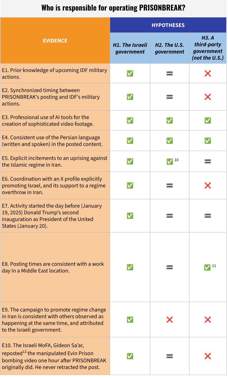 We consider it unlikely that a third-party government (other than the U.S.) is responsible for operating PRISONBREAK. This assessment is informed by several pieces of evidence inconsistent with this hypothesis – notably, the low likelihood that a foreign government would have had prior knowledge of the Evin Prison bombing; the coordination with an AI-driven X profile openly promoting a partnership with Israel in a future Iran freed of the Islamic regime; and crucially, the messaging precisely synchronized with the IDF’s escalation of operations over Iran. While it is conceivable that a professional group could have created the content in an accelerated time frame and with no advance notice, the alternative explanation is more likely. |